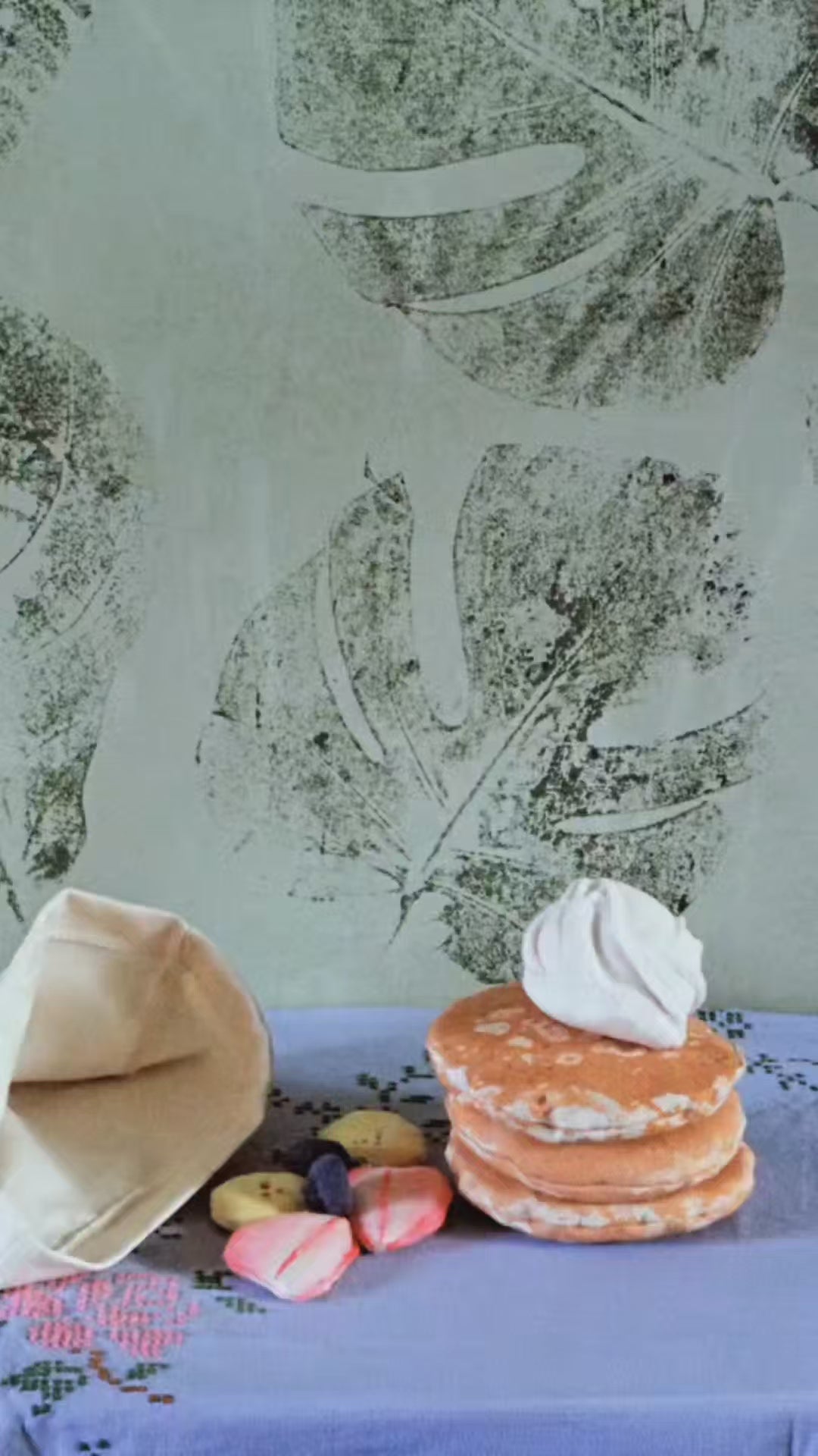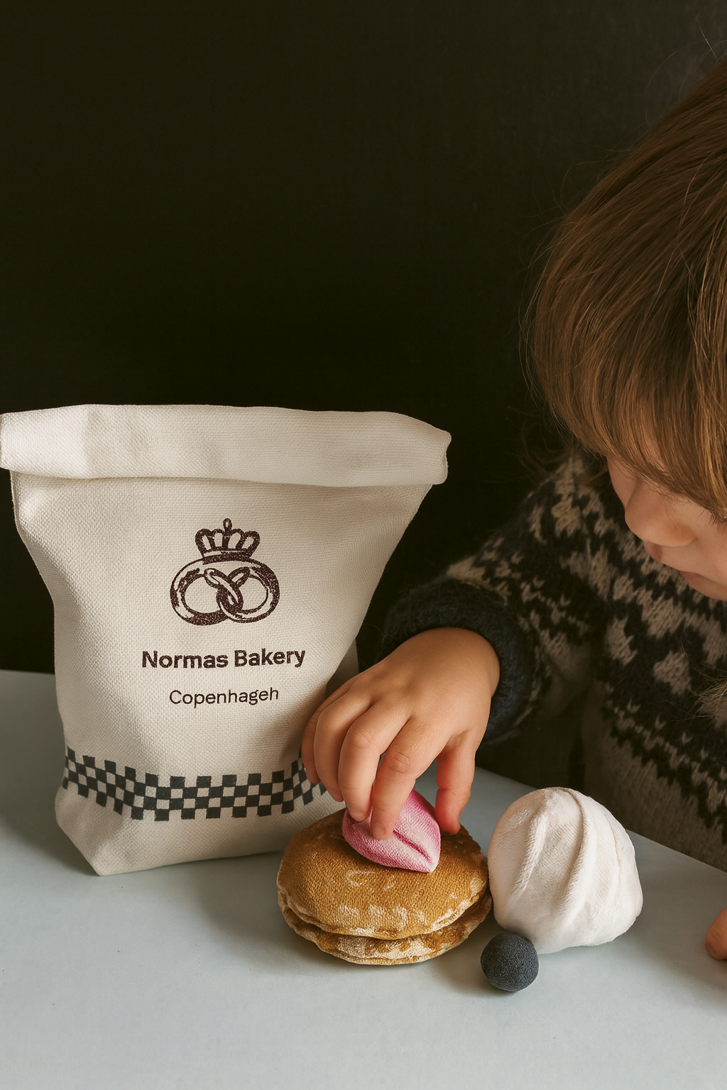Expertly crafted for imaginative play, this eco-friendly set includes 3 soft, fluffy pancakes topped with 2 juicy strawberry slices, 2 creamy banana slices, 2 plump blueberries, and a soft dollop of whipped cream. Everything is lovingly packed in a reusable Normas Bakery cotton bag, making it perfect for storage and gifting.
